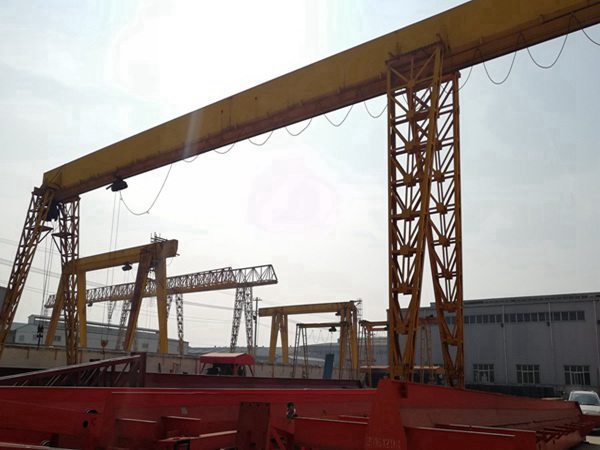 龍門吊單主梁門式起重機結構簡單,制造裝置便當,本身質量小,主梁多為偏軌箱形架結構。與雙主梁門式起重機相比,整體剛度要弱一些。因而,當起重量Q≤50t、跨度S≤35m時,可采用這種方式。單主梁門式起重機門腿有L型和C型兩種方式。L型的制造裝置便當,受力狀況好,本身質量較小,但是,吊運貨物經過支腿處的空間相對小一些。龍門吊租賃廠家C型的支腳做成傾斜或彎曲形,目的在于有較大的橫向空間,以使貨物順利經過支腳。